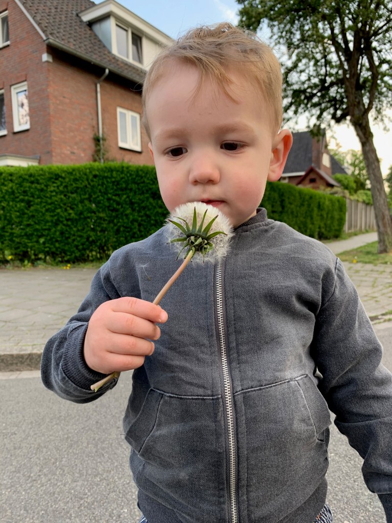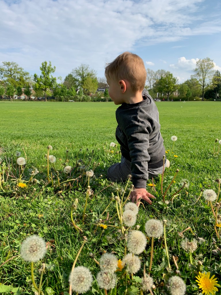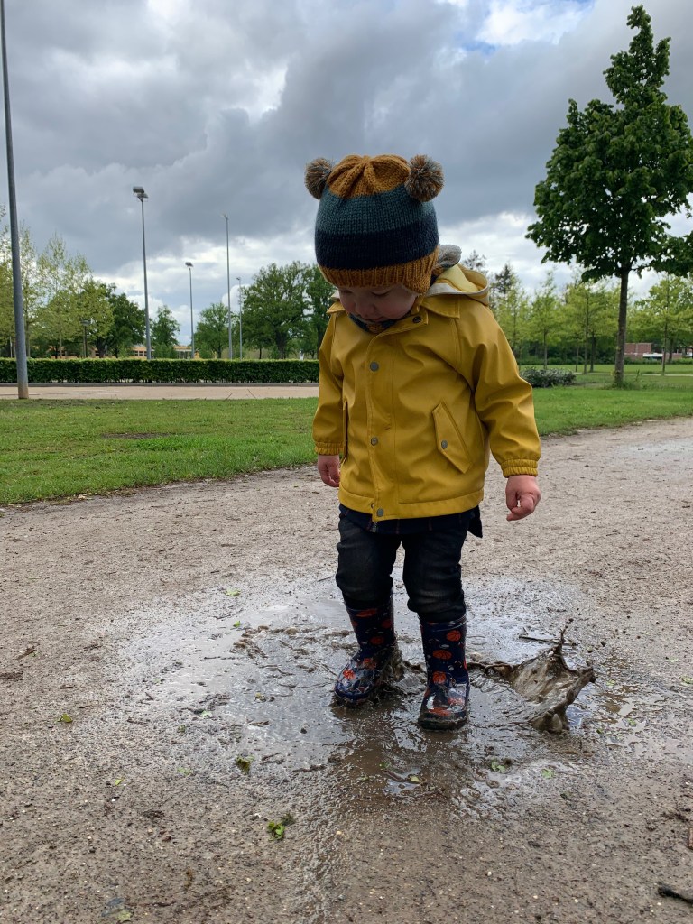 Tussen de buien door zijn we heel veel buiten geweest met James en een van de dingen die hij erg leuk vond was het blazen van paardenbloemen. En of ze nu verregent waren of niet hij blaast 1x en daarna trekt die alle zaadjes snel van het steeltje af. De dikke buien zorgde ook voor mooie plassen water waar James met zijn nieuwe laarsjes mooi in kon spelen en stampen. Tot alles zeiknat en doorweekt was en hij toch de laarzen weer aan wou naar buiten haha.