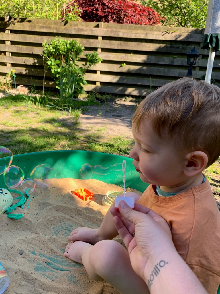 Eind mei kwam de zon weer tevoorschijn en kon er weer lekker in de zandbak gespeeld worden. Was het nog leuker om in de avond even naar het park en de speeltuinen te gaan en konden wij ook lekker buiten eten.